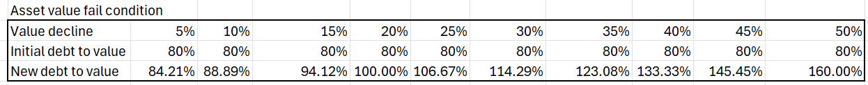However, if that project is 80% debt to value, it would take a mere 20% decline in asset value to wipe out the equity.