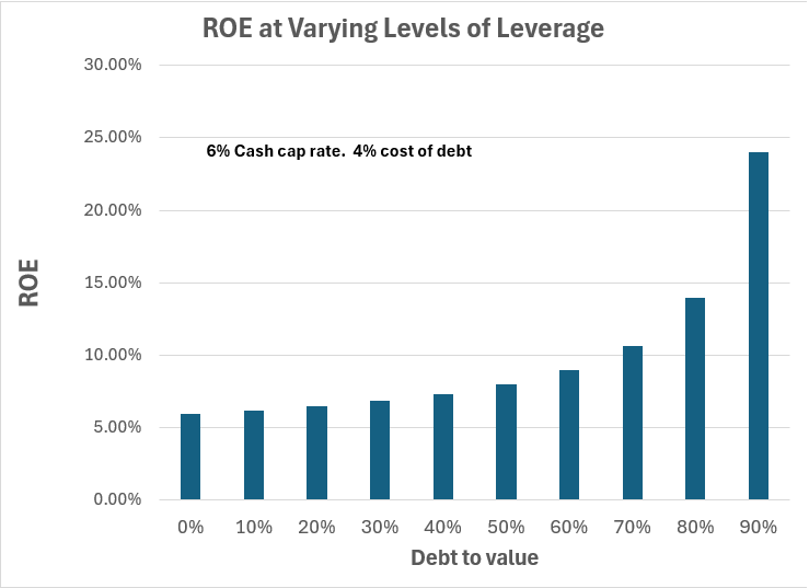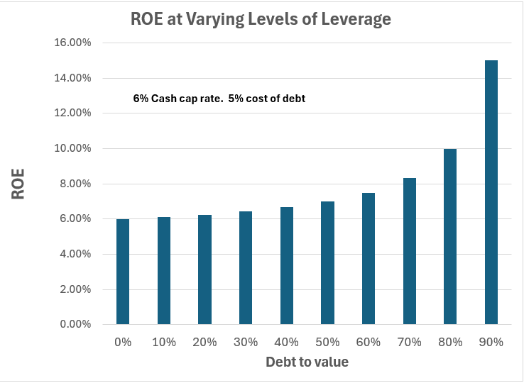 In the current environment there are relatively small spreads between cost of debt and cap rates. A 6% cap rate and 5% cost of debt would be fairly typical. Even with a 1% spread, higher leverage does indeed increase return on equity: