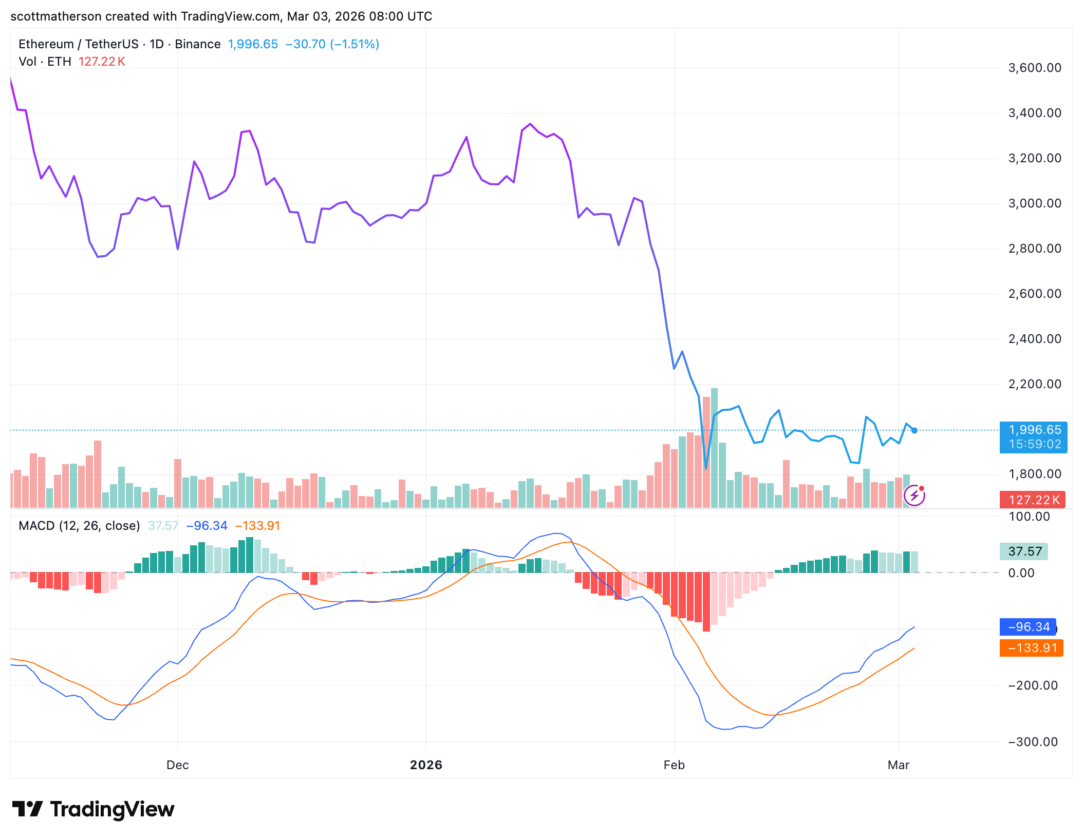 ETH trading at $1,996 on the 1D chart | Source: ETHUSDT on Tradingview.com