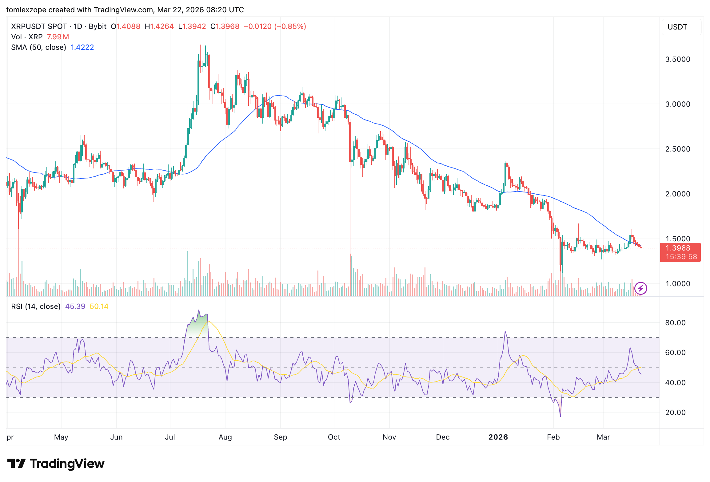 With little influence from the whales driving XRP prices, it becomes more apparent that a local bottom may still be at lower prices. As of this writing, the XRP price stands at approximately $1.44, reflecting a 0.4% loss in the past day.