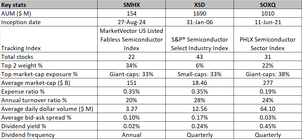 As of March 2026, SMHX remains the only US-listed ETF to offer focused pure-play coverage to fabless semiconductor stocks. If investors are open to looking for ETF options that aren’t overly fixated on just the fabless names, they may also want to take note of the State Street SPDR S&P Semiconductor ETF (XSD) or the Invesco PHLX Semiconductor ETF (SOXQ).