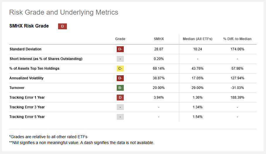 SMHX is still fairly new, but for an ETF that only needs to replicate the performance of 22 stocks from its tracking index (as opposed to 100s or 1000s of stocks), its tracking error of almost 4% (in its first year of operation). This is almost 3x more than the median ETF tracking error (of 1.36%).