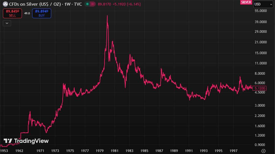 The silver bubble of 1979 to 1980 saw prices surge dramatically in a short period. Based on the London Fix, silver prices rose from about USD 6.08 per troy ounce on January 1, 1979, to a record USD 49.45 per troy ounce by January 18, 1980, a jump of around 713 percent. Silver futures also touched an intraday high of USD 50.35 on COMEX, while the silver to gold ratio fell to about 1:17, with gold itself peaking near USD 850 per ounce the same day. During the final nine months of 1979, the Hunt brothers accumulated more than 100 million troy ounces of silver along with large futures positions.